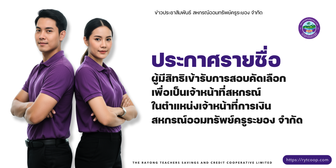 ประกาศ รายชื่อผู้มีสิทธิเข้ารับการสอบคัดเลือกเพื่อเป็นเจ้าหน้าที่สหกรณ์ในตำแหน่งเจ้าหน้าที่การเงินสหกรณ์ออมทรัพย์ครูระยอง จำกัด
